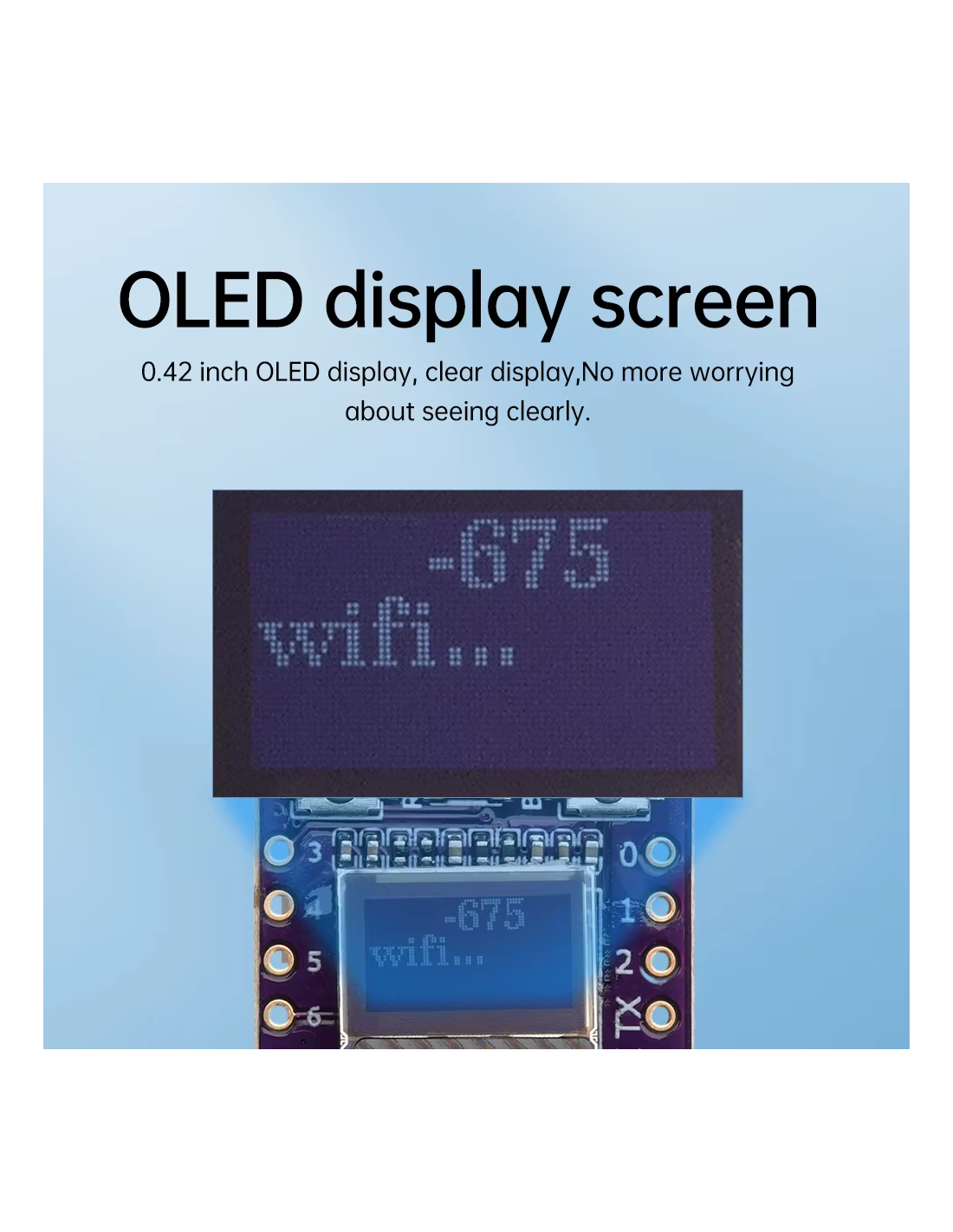 1. Эта плата разработки оснащена 0,42-дюймовым OLED-дисплеем, керамической антенной, интерфейсом USB Type-C, кнопкой сброса и кнопкой запуска, что делает ее простой и быстрой в эксплуатации.